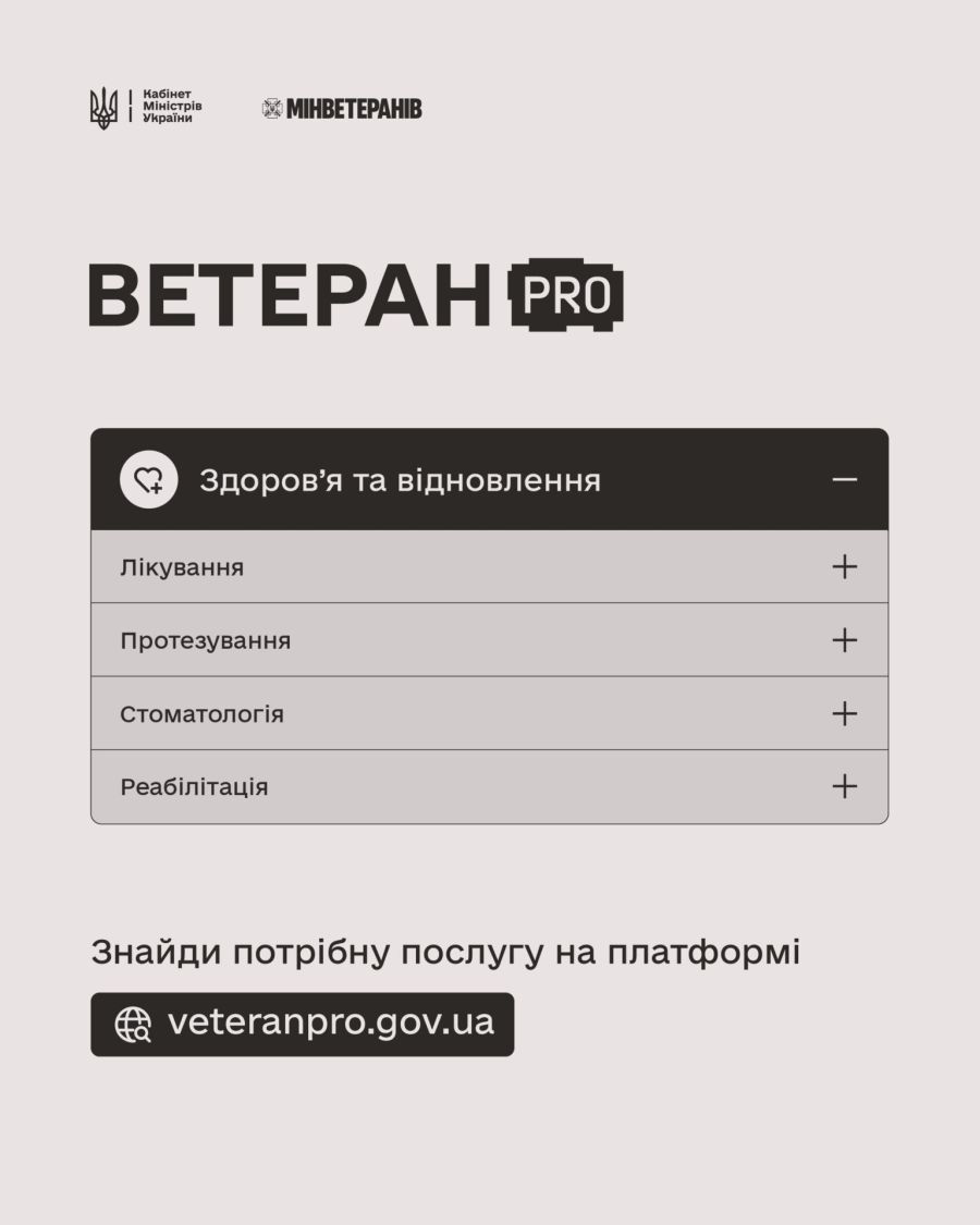 Послуги для здоров’я та відновлення ветеранів і ветеранок Держава забезпечує доступ до таких напрямів підтримки: Лікування — первинна та паліативна медична допомога, офтальмологічні послуги, програма «Доступні ліки». Протезування — протези кінцівок, вироби підвищеної функціональності, ремонт...